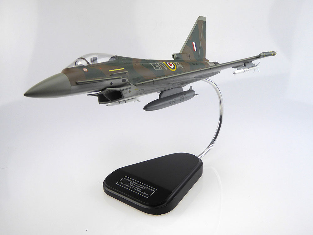 This specially painted Eurofighter Typhoon, flew alongside the Battle of Britain Memorial Spitfire during the summer of 2015, to commemorate the 75 Anniversary of the Battle of Britain. The paint Scheme replicates the Hurricane flown by Flt Lt Nicolson, the only Victoria Cross Winner in the Battle of Britain. The model and aircraft also feature the red devil emblem, which was Nicholsons personal device. This is superb limited edition model, hand carved and hand painted it will make a centre piece of any collection.