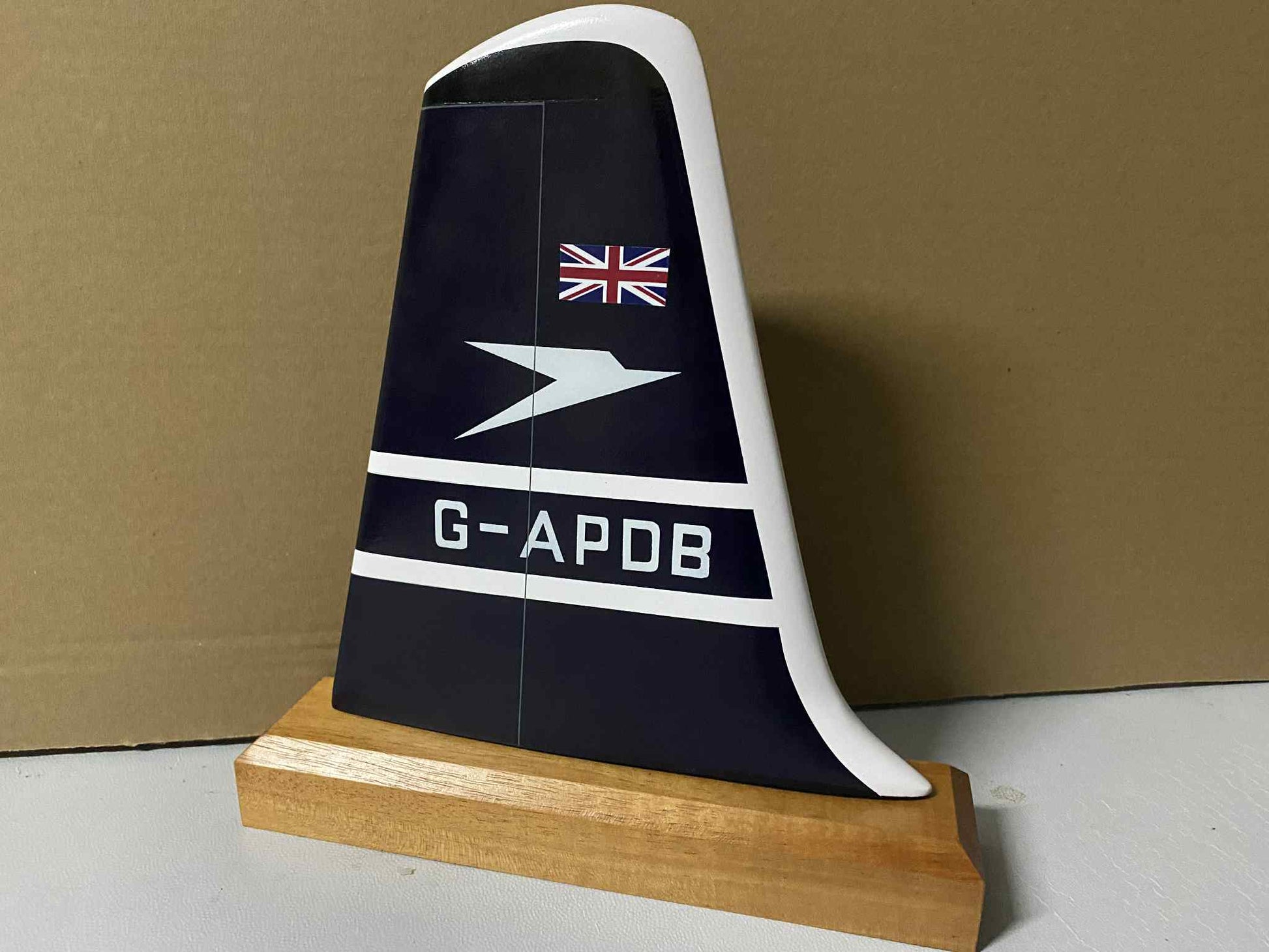 Hand Carved and hand painted aircraft tail fin on a wooden base.