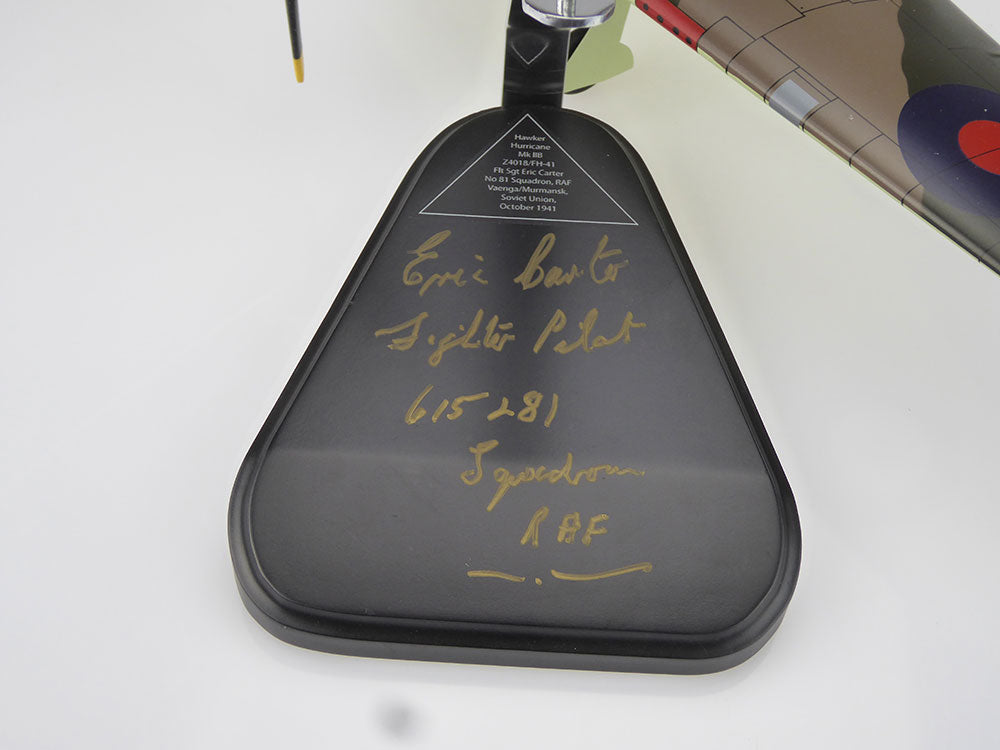 Hurricane Z4018 was flown by Flt Sgt Eric Carter during a secret mission in 1941, code named “Force Benedict”. The mission, sanctioned by Winston Churchill, at the request of Stalin was a force dispatched to defend Murmansk, the USSR’s only port not under Nazi occupation and the largest city North of The Arctic Circle. The Hurricanes were flown into Vaenga Airport, from HMS Argus and were immediately engaged in fighting the enemy. In its first five weeks of operations the wing had claimed 16 victories, 4 probable and seven damaged aircraft. Eric Carter also saw service defending the skies over England, and towards the end of the war in India and Burma. In 2005 Eric was awarded the Arctic Star, and on 26 August 2104 he was the Ushakov Medal