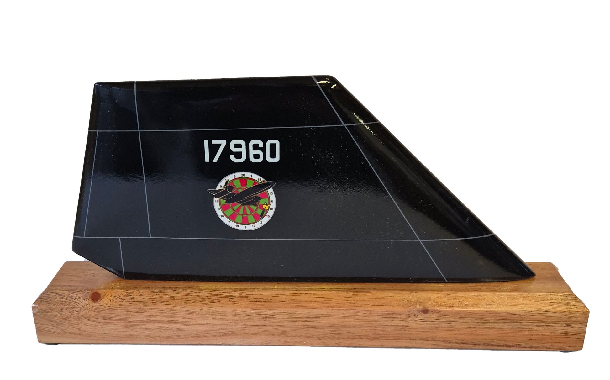 Hand Carved and hand painted aircraft tail fin on a wooden base.