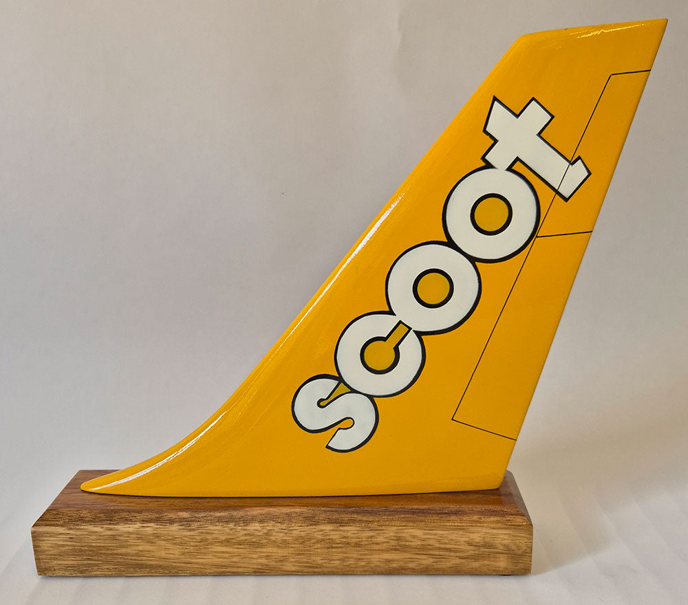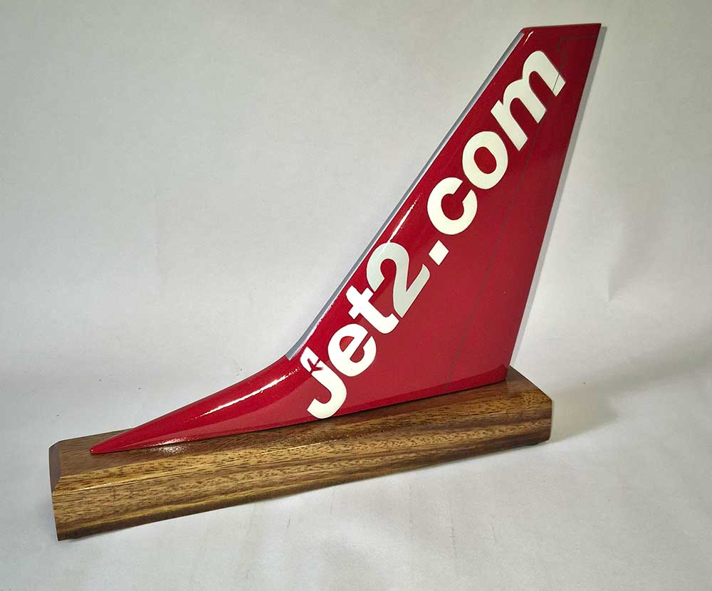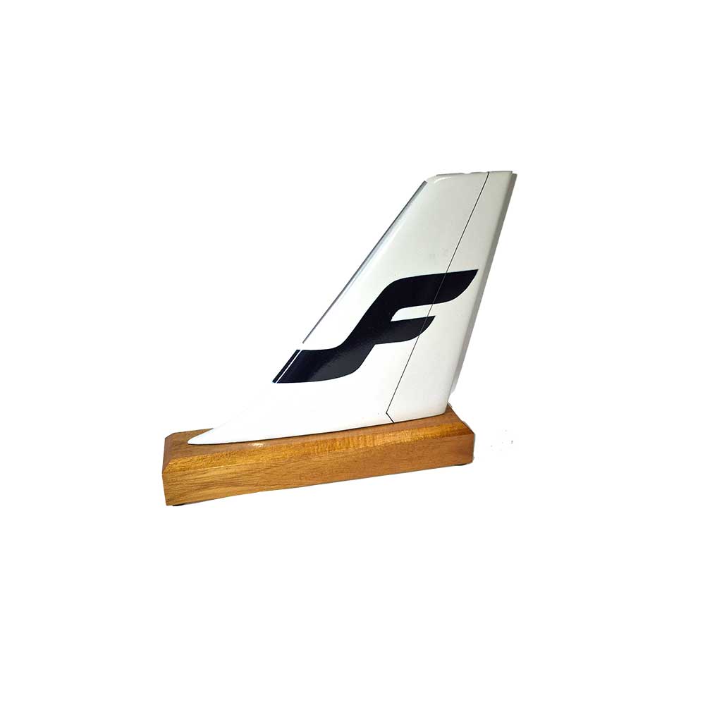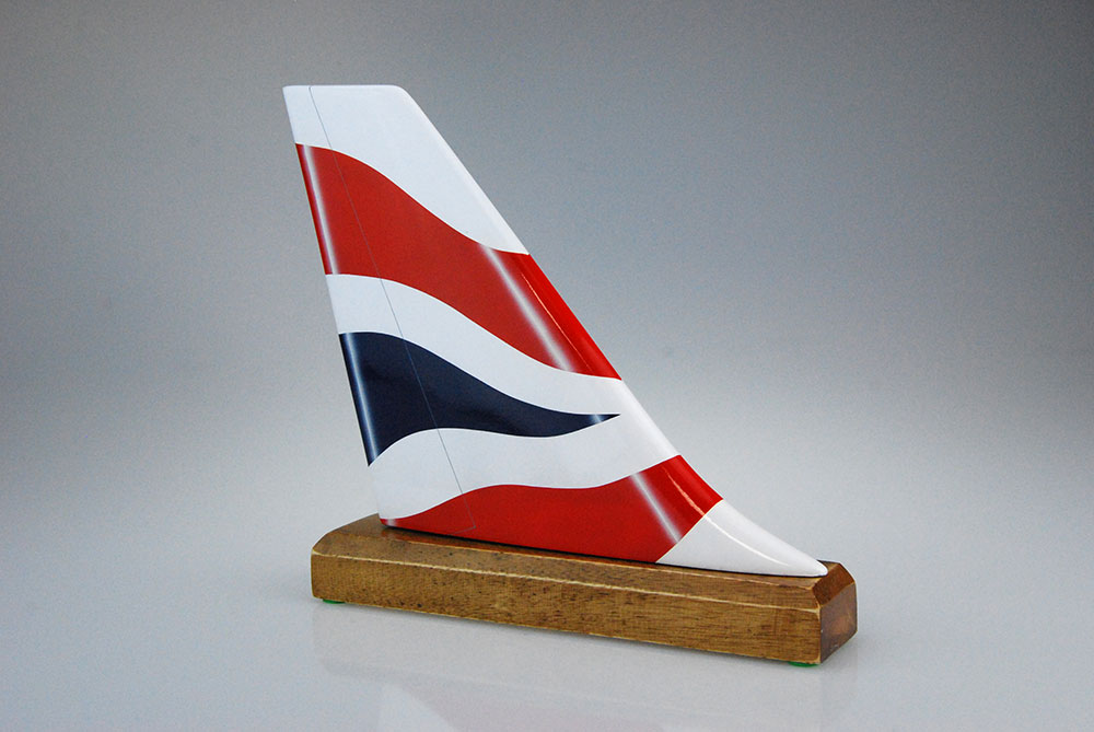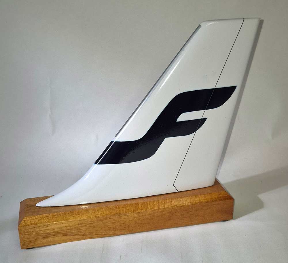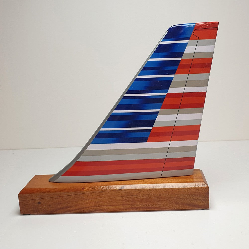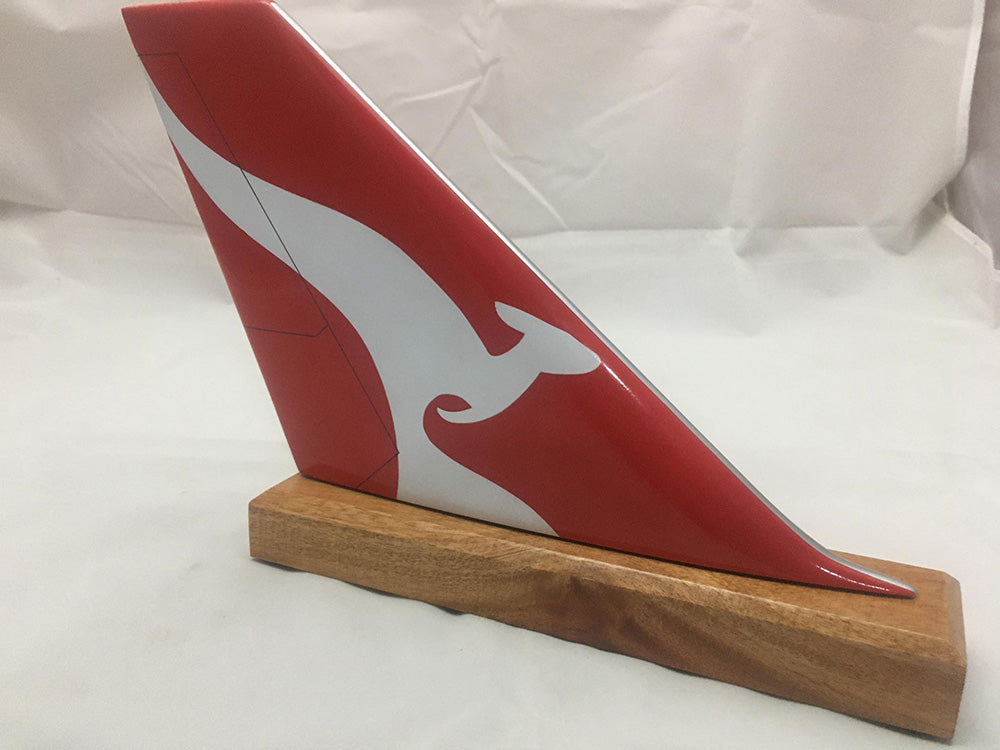 Hand Carved and hand painted aircraft tail fin on a wooden base.